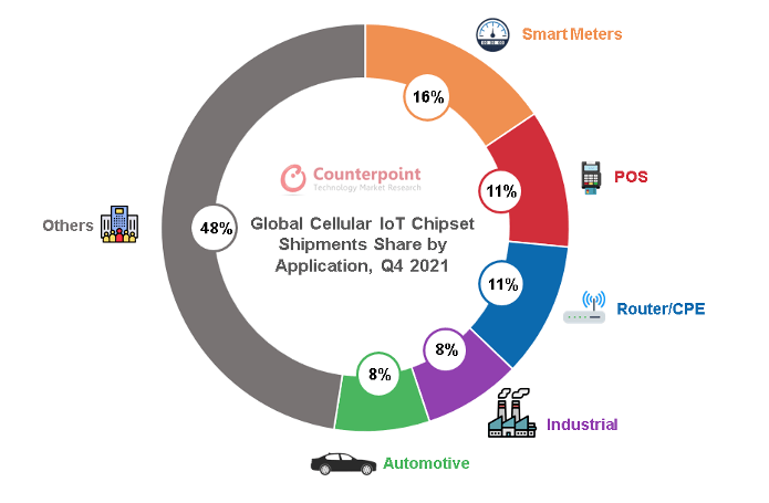 在蜂窩物聯(lián)網(wǎng)芯片中,當(dāng)前應(yīng)用規(guī)模最大的是低速率的NB-IoT芯片(占比60%),NB-IoT也是我國主推的物聯(lián)網(wǎng)連接方式,應(yīng)用在智能儀器表盤、資產(chǎn)追蹤等場景。其次是中速率的2G/3G(占比30%),用于移動(dòng)支付、智能穿戴和智能家居中。4G Cat.1和5G大約占比10%, 5G模組的成本過高,加上大部分物聯(lián)網(wǎng)終端對(duì)傳輸速率的需求性不高,5G在物聯(lián)網(wǎng)終端的應(yīng)用占比較低,主要是自動(dòng)駕駛和視頻監(jiān)控領(lǐng)域,但隨著2G/3G轉(zhuǎn)網(wǎng),Cat.1在智能支付、定位追蹤、車載終端、視頻監(jiān)控領(lǐng)域的高速增長,正逐漸打破蜂窩物聯(lián)網(wǎng)6:3:1的格局。從應(yīng)用場景來看,智能表計(jì)、POS支付、路由器/CPE、工業(yè)、汽車是蜂窩物聯(lián)網(wǎng)芯片應(yīng)用最廣泛的前五大場景。