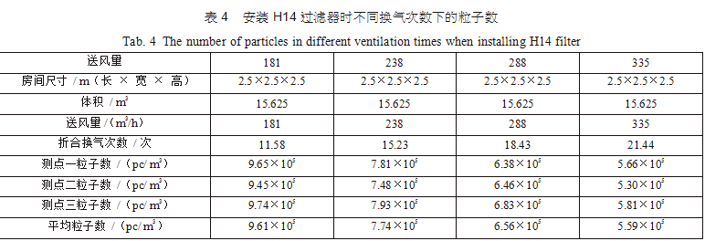 在空調(diào)機房中新建了三間2.5m×2.5m×2.5m的潔凈間,從空調(diào)主風(fēng)管引風(fēng),每支支管設(shè)置調(diào)節(jié) 閥,并設(shè)排風(fēng)機進行全排,送回風(fēng)口及測點布置分別如圖 3(每點取樣三次,取平均值)??紤]到初中效過濾器對最后潔凈度的影響和最后理論塵埃數(shù)量 計算的方便,試驗用初中效繼續(xù)分別為G4、F8,三個房間分別安裝高效過濾器,風(fēng)量500m3/h,第一組數(shù)據(jù)為送風(fēng)量按GMP 驗證指南推薦換氣次數(shù)保持不變,分別用H12、H13、H14、U15過濾器,第二組數(shù)據(jù)為采用H13高效過濾器,調(diào)節(jié)風(fēng)量 ;第三組數(shù)據(jù)為采用H14高效過濾器,調(diào)節(jié)風(fēng)量,分別測得塵埃粒子數(shù),并列表得出不同的換氣次數(shù)下對應(yīng)的塵埃數(shù)如表2、表3、表4。